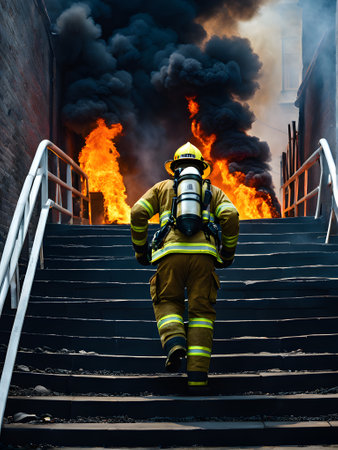 Volunteer firefighter enters burning room during an exercise to extinguish fire and save people. Firefighter use oxygen cylinders to enter smoky rooms. Firefighter from back entering burning building