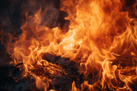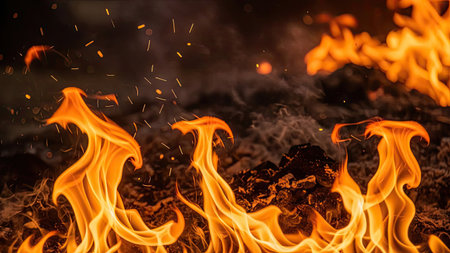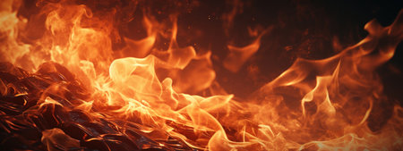 Witness the captivating power of fire with this intense image. A close-up view of fire flames takes center stage against a dark black background, creating a mesmerizing and dynamic composition. The vibrant and flickering flames create a sense of energy and intensity, while the black backdrop adds depth and drama to the scene. Perfect for projects related to heat, energy, passion, danger, and the elemental force of fire