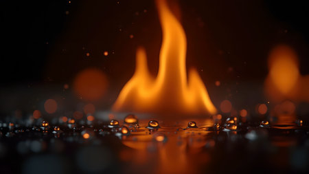 This captivating image features flames flickering on a wet surface, illuminated by raindrops creating a dramatic visual effect. The interplay of fire and water showcases nature's beauty.