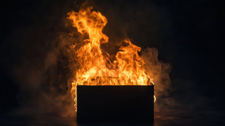 A wooden box is ablaze, with flames rising dramatically and filling the surrounding area with smoke. The fire creates a striking visual in the dark environment
