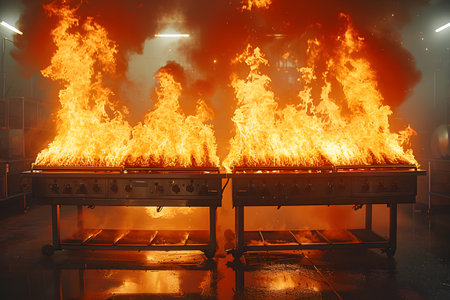 A captivating scene of a major fire erupting from grills in a commercial kitchen. the flames reach high, creating an intense and dramatic visual spectacle. this image is suitable for illustrating fire safety, emergency response, and culinary environments.