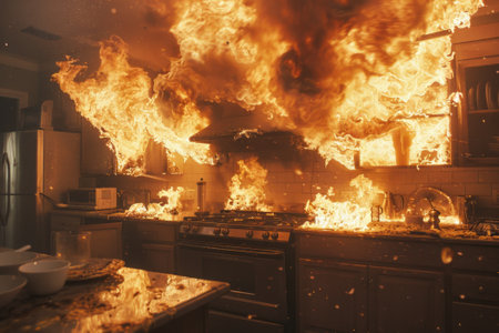 Kitchen in flames, fire accident in the house.