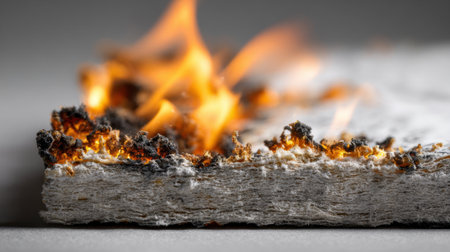 Flames rise from the edge of a burning material highlighting the texture and damage from the fire. The scene captures the intensity of combustion and its effect on the surface.