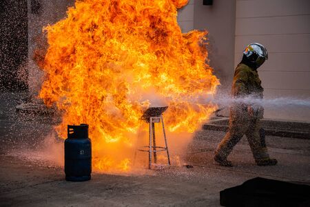 Firemen using extinguisher and water for fight fire during firef.