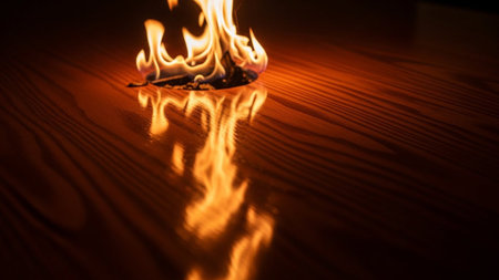 A vibrant and intense flame burns fiercely from a dark circular opening on a highly polished wooden surface. The flame's bright orange, yellow, and red hues cast a warm, dynamic glow, reflecting vividly on the glossy, dark wood. The wood grain is clearly visible, adding a rich texture to the scene. The reflection of the fire is sharp and detailed, creating a striking contrast between the destructive power of the flame and the smooth, surface it consumes.