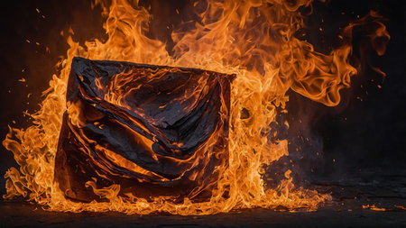 A mesmerizing square frame engulfed in vivid flames and billowing smoke creates a captivating scene, blending chaos with artistic beauty.