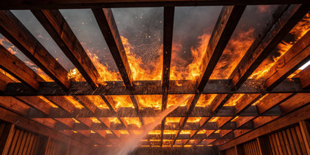 Firefighters are battling a raging fire as flames consume wooden beams overhead, with water being sprayed to combat the blaze as smoke billows.