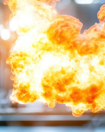 A vivid combustion reaction unfolds in a laboratory, showcasing flames, heat waves, and gaseous emissions under bright lighting.