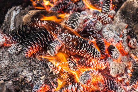 Burning cones in a fire close up