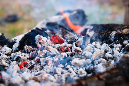 Fire with coals and fire on nature picnic background. Burns out a bonfire for food on the street