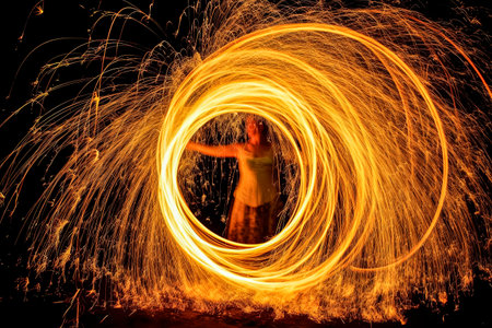 Silhouette with Fire Ring Light Painting, Long Exposure Sparks