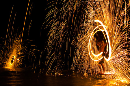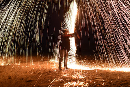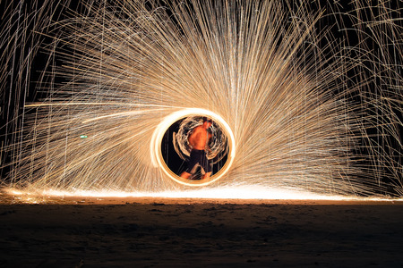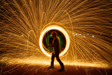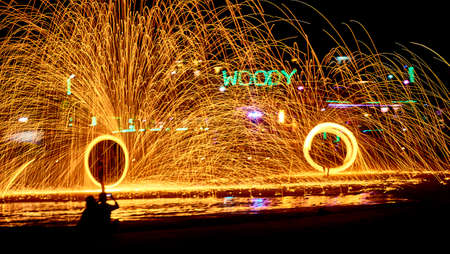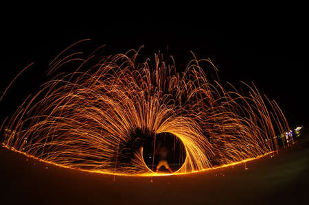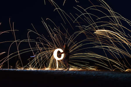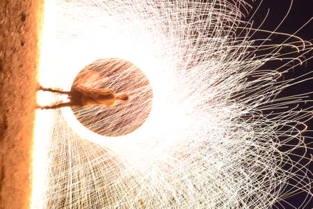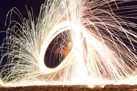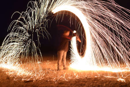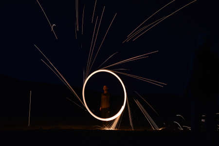 Iron wool circle drawing light fireworks. Burning Steel Wool spinning, Trajectories of burning sparks at night. Movement light effect, steel wool fire hoop. long exposure light painting, Pyrotechnic