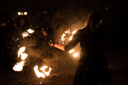 Fire show. Fire performance at the night.