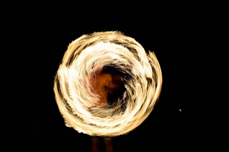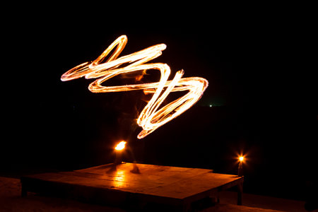 Light painting and long exposure picture of a street artist fire juggling performance. Phi Phi Island, Thailand.