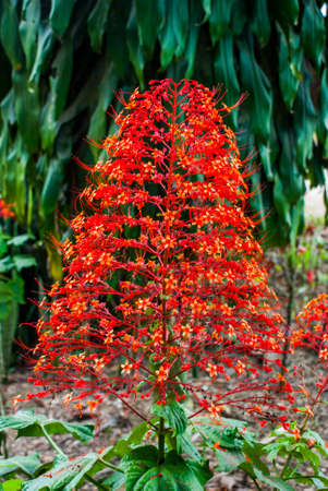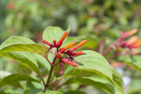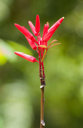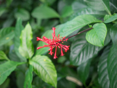 red flower spike, Rubiaceae flower with green leaves background