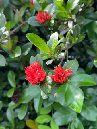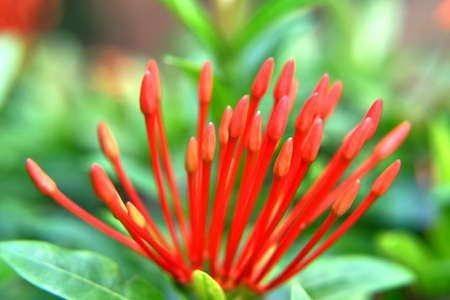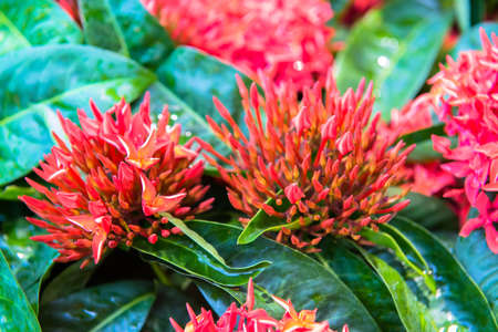 A close-up of red ixora buds on green leaves background. Ixora is garden decorative flower. In Thailand, ixora is used in the ceremony of teacher’s day and represented of cleverness of the students.