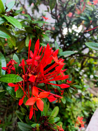 Red Ixora flower blooming in the garden, Thailand.