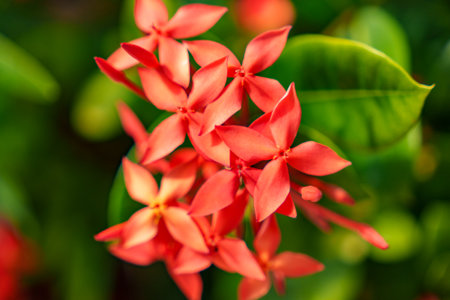 Red Ixora flower in the garden with blurred background, stock photo