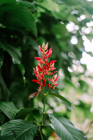 A close-up shot captures vibrant red flower buds and delicate blossoms amidst lush green foliage. This tropical plant creates a beautiful and colorful natural display.