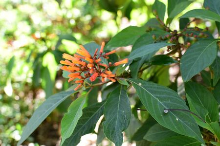 Orange color flower on tree with natural green background, Scarlet bush, Firebush, Hamelia patens, Redhead