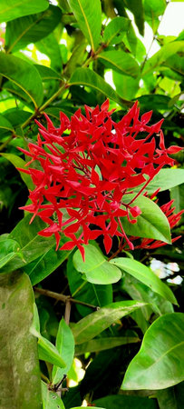 The Red Ixora Flower Blooming in The Bunch on The Center of Frame
