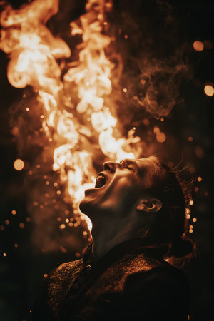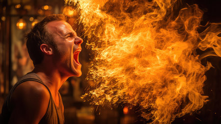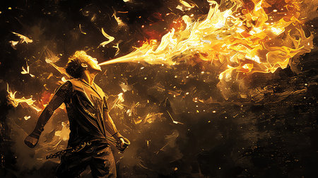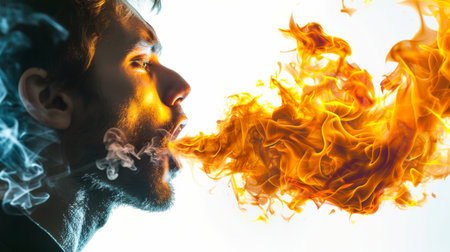 A captivating artwork depicting a man exhaling bright, fiery flames against a dramatic background, symbolizing energy, power, and creativity in a striking and imaginative visual composition.