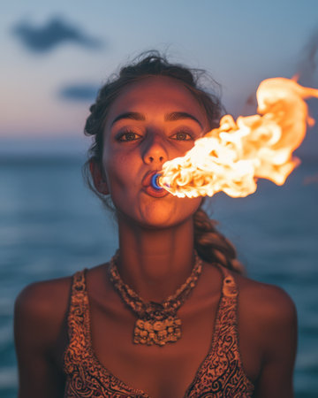 Young woman breathes flame against tranquil ocean twilight. AI-generated.