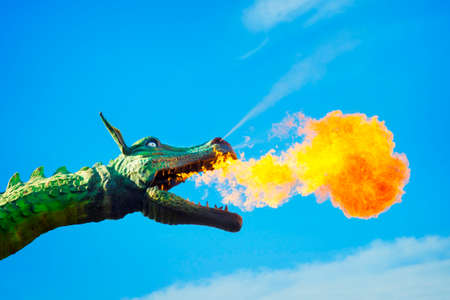 Head of dragon blowing fire on blue sky.