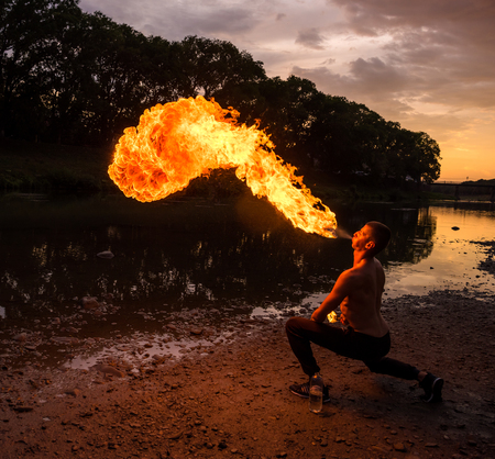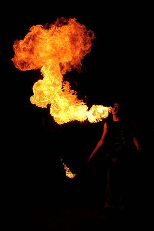 A Fire show artist breathe fire in the dark jamp