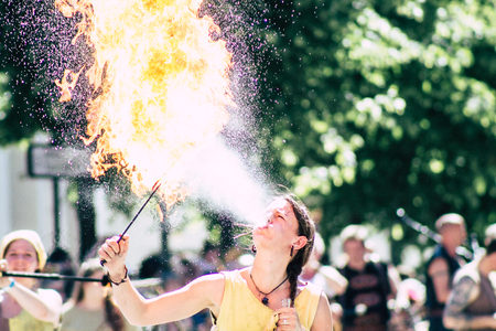 STRASBOURG, FRANCE - APR 9, 2016: Fire-eater performing as people join the 'Nuit Debout' or 'Standing night' movement at the Place de la Republique in Strasbourg