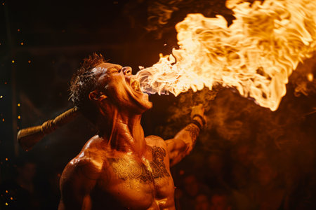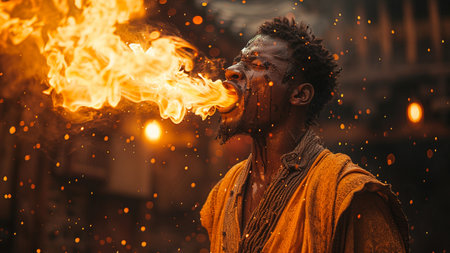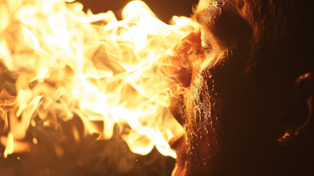 A fire eater bravely swallowing flames and breathing fire into the air mesmerizing the audience with daring feats of courage