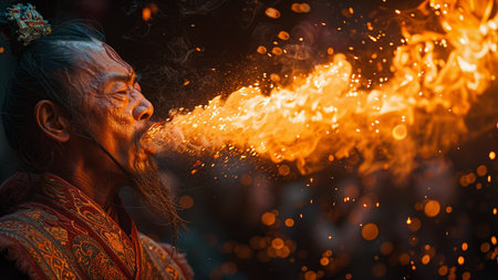 A captivating image of a skilled fire performer exhaling flames, creating an intense, energetic moment. The fiery display and glowing atmosphere highlight creativity, passion, and the wonder of live performance art.