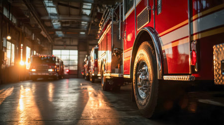 Warm sunlight bathes the spacious garage as sleek red rescue vehicles stand in precise formation, casting elongated shadows over polished concrete surfaces.