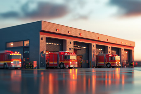 A striking image of a fire truck standing ready in a dimly lit industrial warehouse, showcasing its powerful design with vivid lights, reflecting on the wet floor, symbolizing readiness for emergencies.