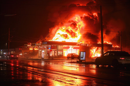 Fire at a gas station. A burning building next to a road with moving traffic.