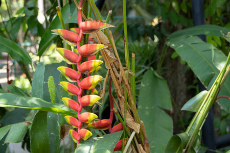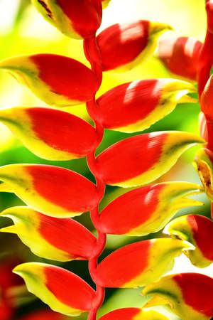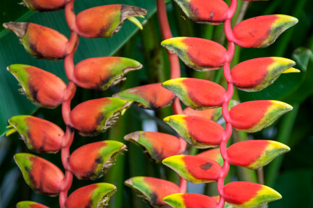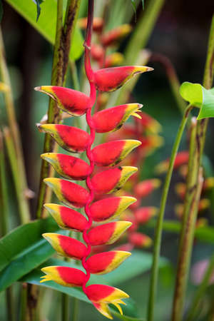 Red and yellow colored heliconia flowers against green leaves background, close-up
