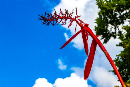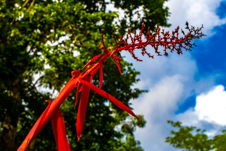 Tropical plant with beautiful red stem flower blossom in Coba Ruins Municipality Tulum Quintana Roo Mexico.