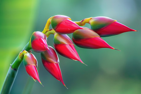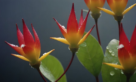Tropical background featuring bright red and yellow heliconia flowers and green leaves: Bold and vibrant, perfect for a tropical garden