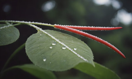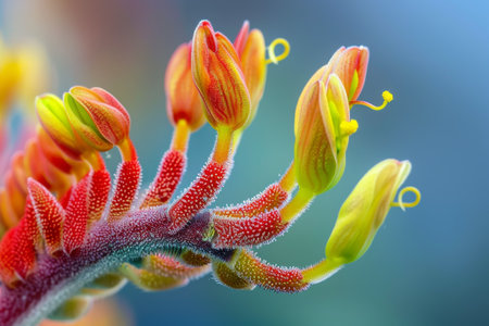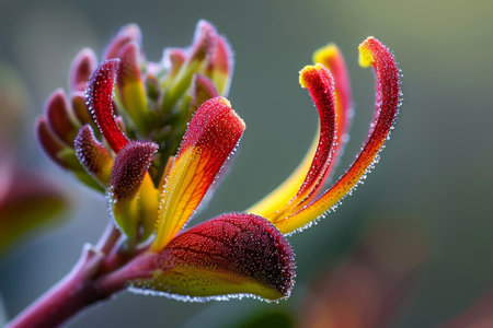 A detailed view of a Kangaroo Paw flower, showcasing delicate petals with water droplets adorning them. The image captures the intricate beauty of nature up close.