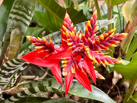 Stunning tropical flower with vibrant red and yellow petals in a lush green garden setting, evoking feelings of serenity and connection to nature.