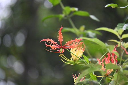 Close up of a flame lily or Gloriosa superba - blooming in a garden, featuring bright red and yellow petals that resemble flames. tropical flower and ornamental plant