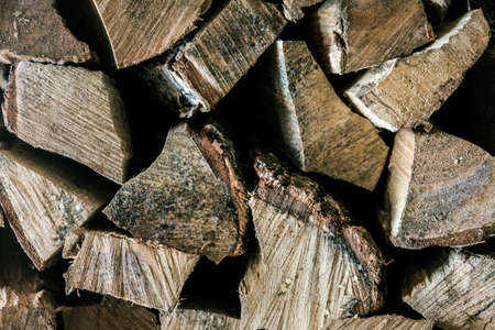 Woodpile lies in a heap, chopped for burning in a furnace. Finely chopped and stacked firewood, background. Laid dry firewood, texture, background. Firewood wall, dry chopped firewood background.
