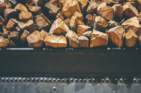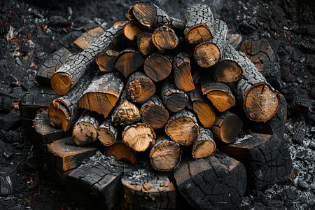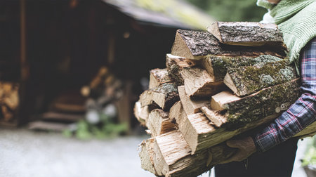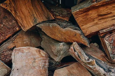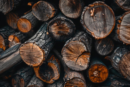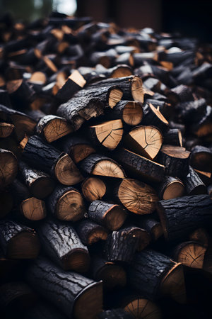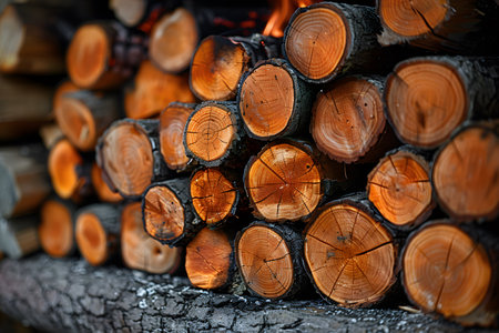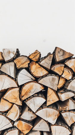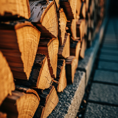 Stacked firewood logs arranged neatly in a rustic environment, highlighting the natural textures and warm colors of the wood, creating a cozy and inviting atmosphere for outdoor settings
