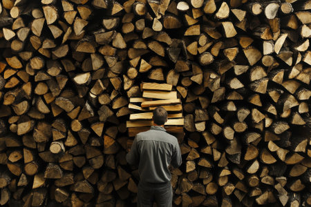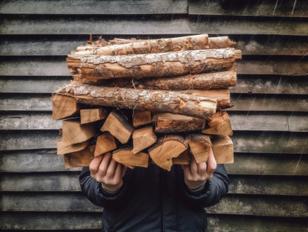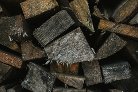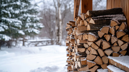 Neatly stacked firewood in rustic setting with natural wood textures and warm tones. Perfect for eco, energy, and rural lifestyle visuals