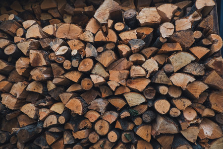 Firewood logs stacked and ready for winter heating, showcasing the cross section and bark of the wood