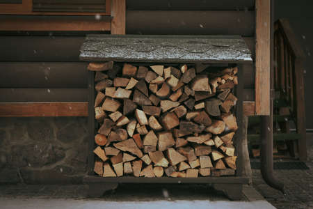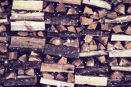 Dry Firewood neatly stacked in the woodpile. Background with a painted snow.