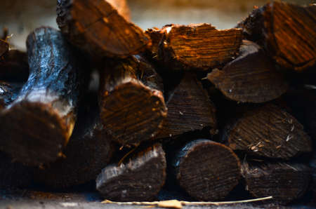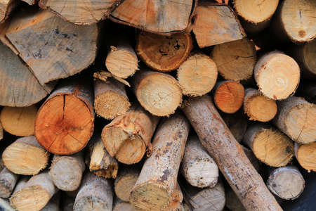 Stack of chopped logs in the forest close-up with space for text. High quality photo
