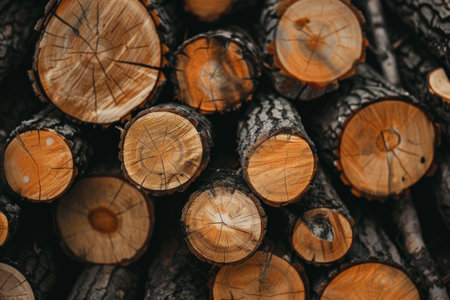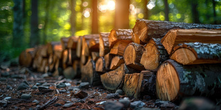 A closeup view of neatly stacked hardwood logs in a forest. The warm textures and natural light create a serene outdoor atmosphere ideal for various creative projects.