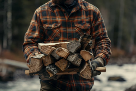 Man traveler hands holding firewood for fire in mountains. place for inscription