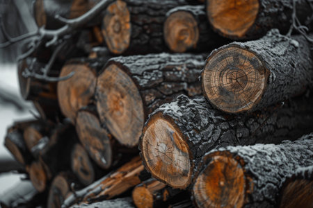 Stacked wooden logs covered in snow, showing the beauty of firewood, lumber, and nature during winter with a snowy touch.